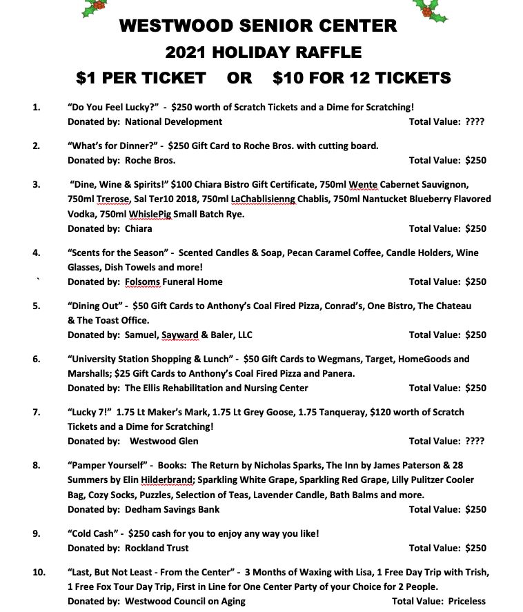 Westwood's Council on Aging is currently holding its Annual COA Basket Fundraiser. Participants can drop by COA at 60 Nahatan Street to view the baskets which have been donated to COA to be raffled off. Each basket is worth $250 or more. The raffles for the baskets will be held on Wednesday, December 15, 2021. Proceeds will support those in need in the community.