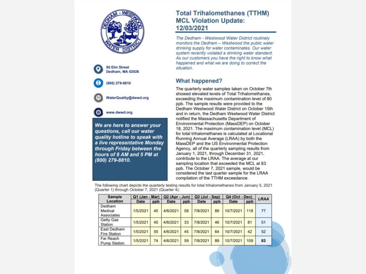 In an update from Dedham-Westwood Water District that was posted today on the Town of Westwood's Twitter account, DWWD has provided results of its November 18 ,2021 water testing for total trihalomethanes (TTHMs) and the results are a mixed bag.