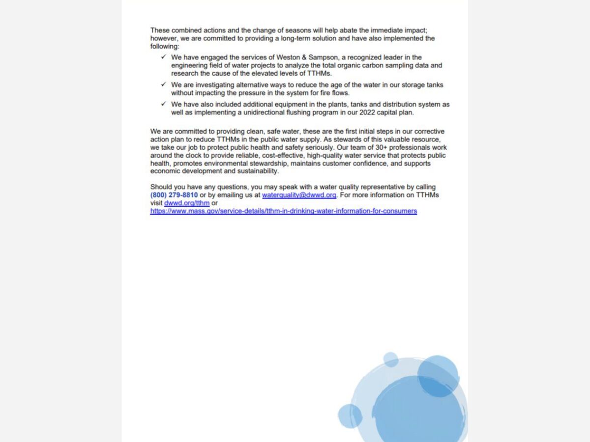 The December update highlights DWWD's ongoing mitigation measures. DWWD has engaged the services of Weston & Sampson, an environmental and engineering consulting firm, to research the cause of the elevated TTHMs. It has increased the blended and supplemental water supply from the Massachusetts Water Resource Authority to reduce TTHM in the water supply. It has also increased sampling, testing, and monitoring of TTHM.