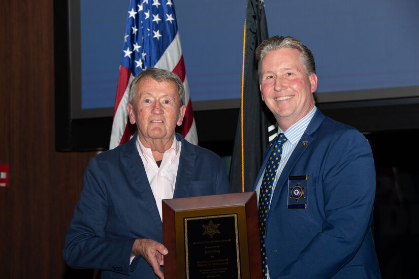 Photo courtesy of Norfolk County Sheriff's Office. Sheriff Patrick McDermott (right) recognizes Mr. John King (left), who is a Norfolk County Hero. Himself a veteran, Mr. King was recognized for volunteering to give rides to veterans for medical appointments, shopping, and other reasons.