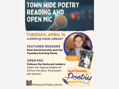 Westwood Fri. Apr 4 2025 Fourth Annual Town-Wide Poetry Reading & Open Mic Slated for Tuesday, April 15 Poetry reading & Open Mic at the Westwood Public Library Lynne Viti Contributor