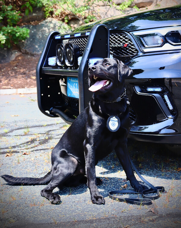 Photo courtesy of Westwood Police Department. Scout, a black Labrador retriever, is a new member of Westwood Police Department who will be receiving his own bullet and stab protective vest from Vested Interest in K9s.